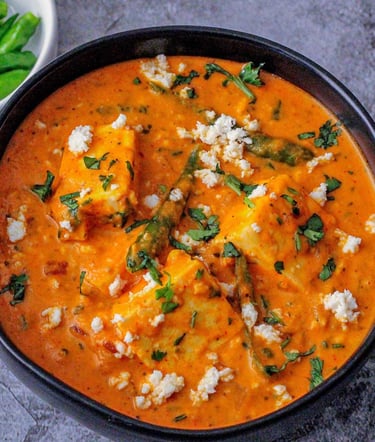 🍴 Ingredients : Fresh paneer cubes, butter, fresh cream, ripe tomatoes, cashew paste, ginger-garlic, green chilies, cumin seeds, garam masala, cardamom, cloves, kasuri methi, coriander leaves, and aromatic Indian spices.